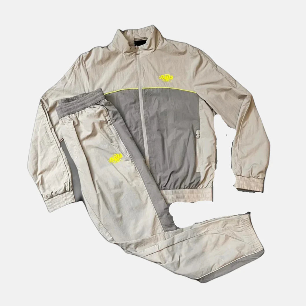 Central Cee várva várt Syna-világa tréningruha (más néven Syna logós tréningruha) Világosszürke/Volt színű külsővel. Ez a termék szettben eladó, és tartalmazza a kapucnis pulóvert és a melegítőnadrágot.