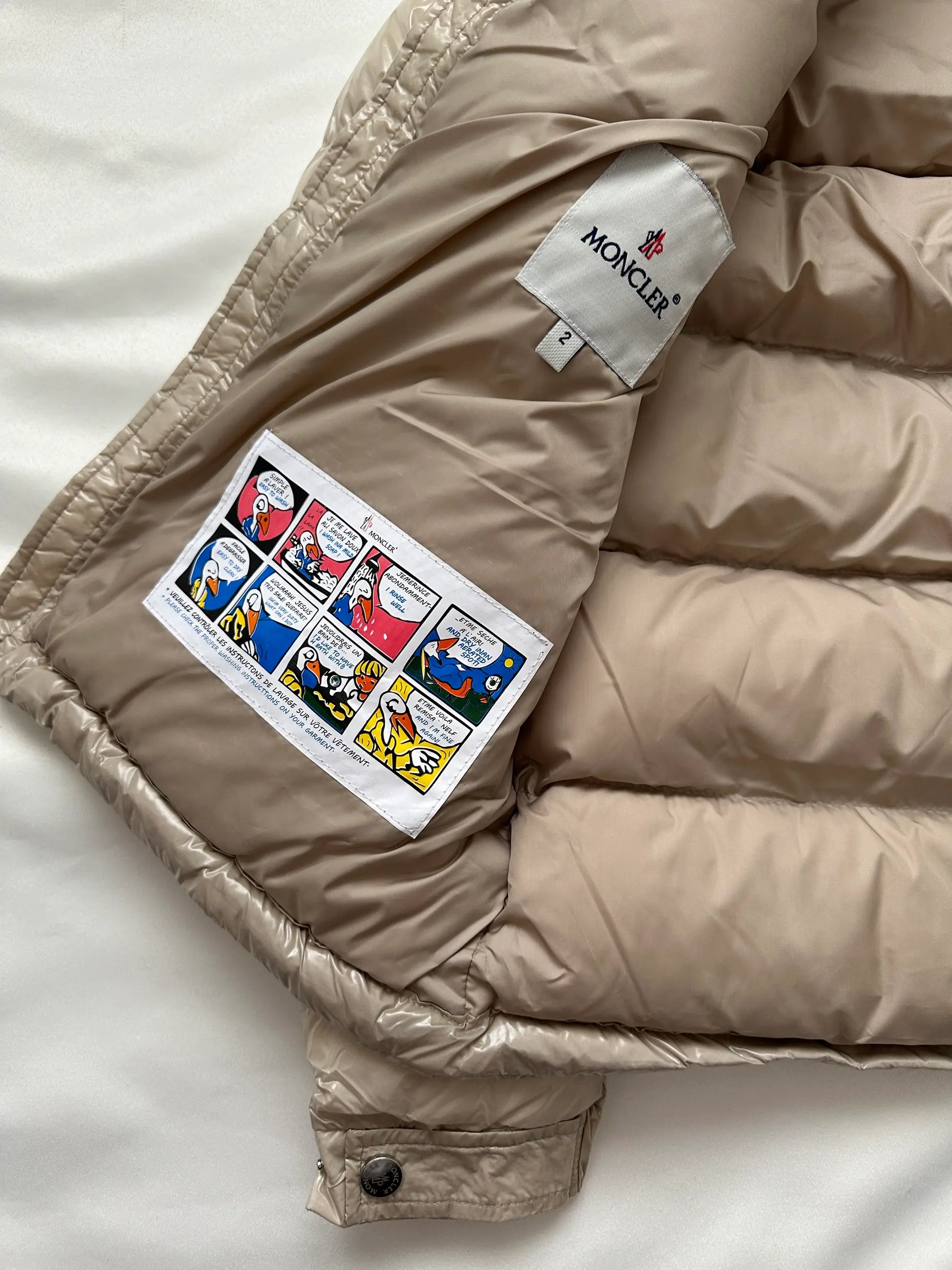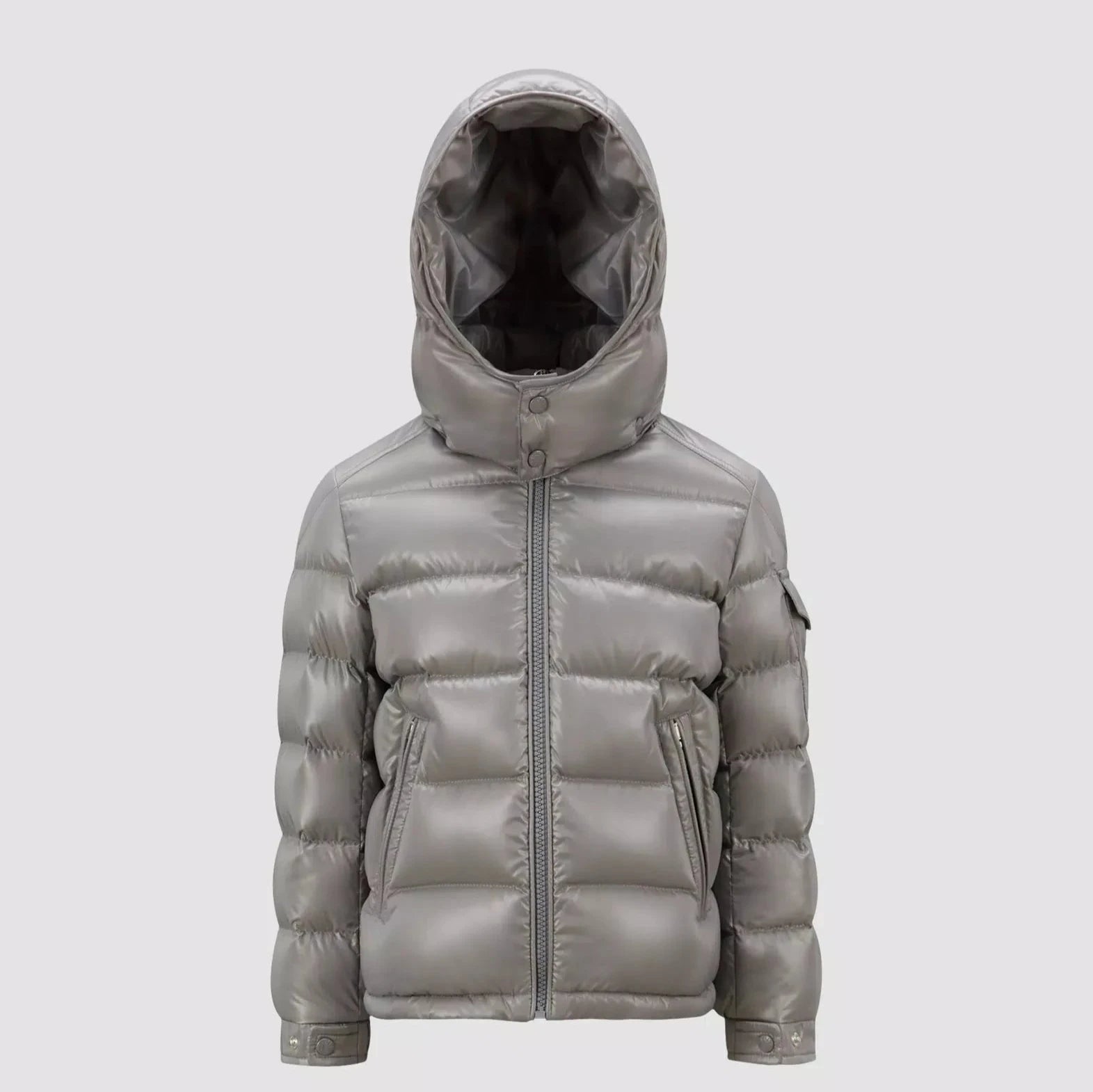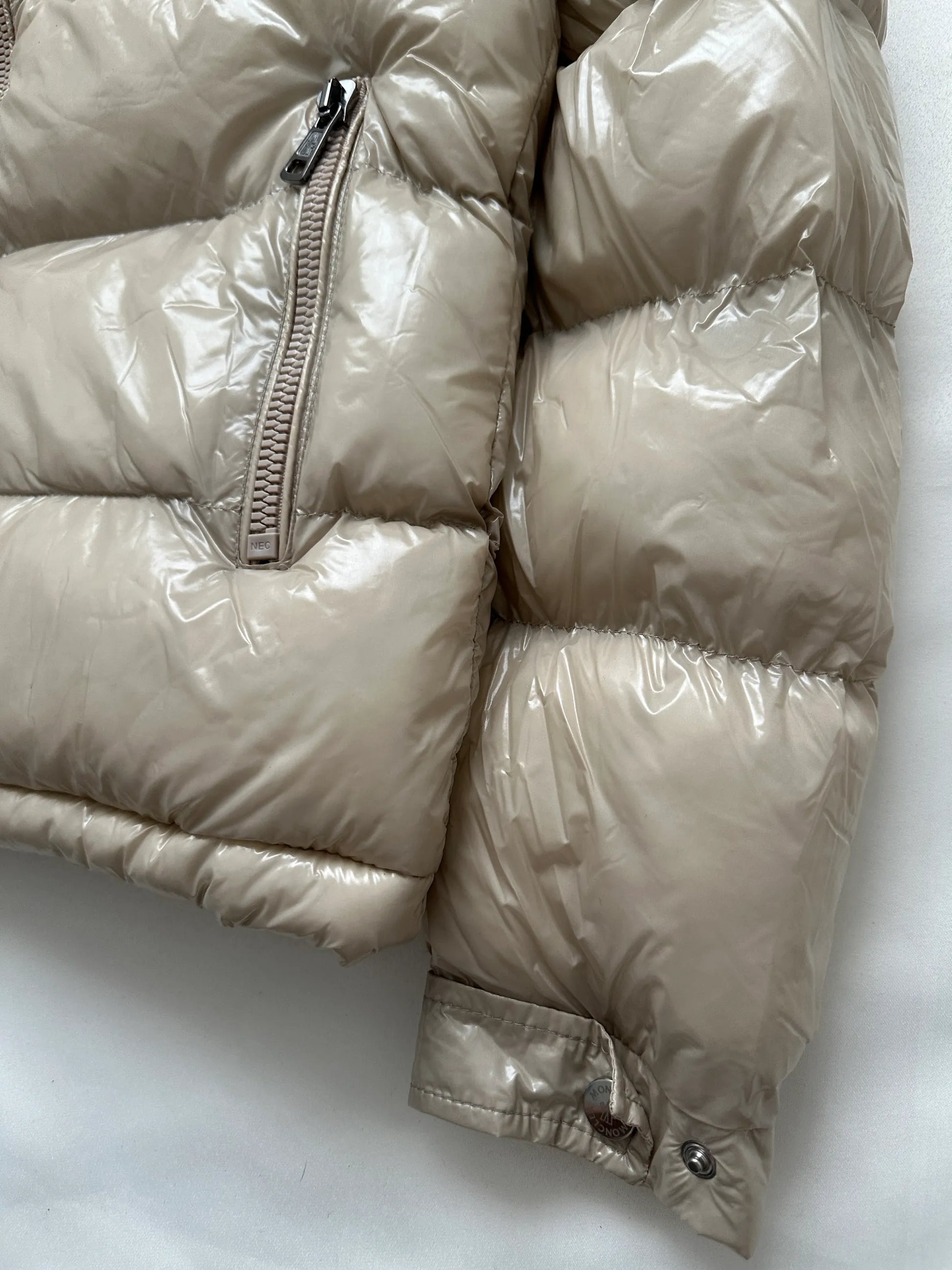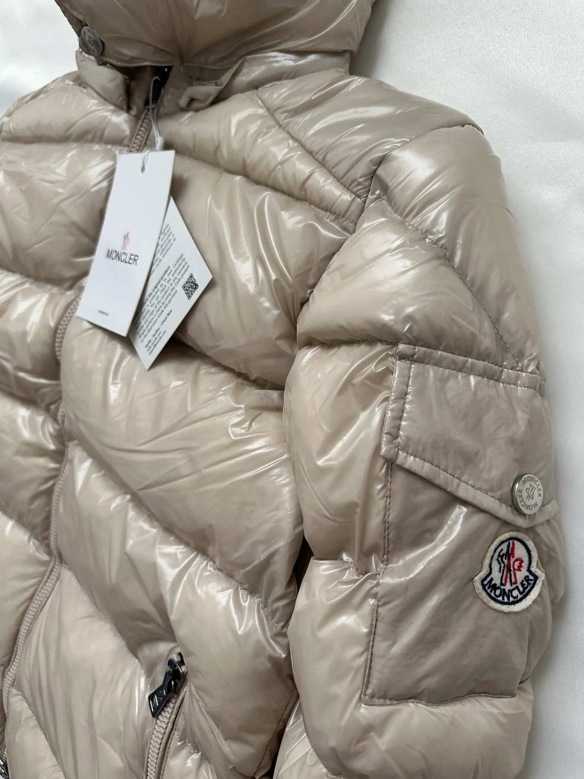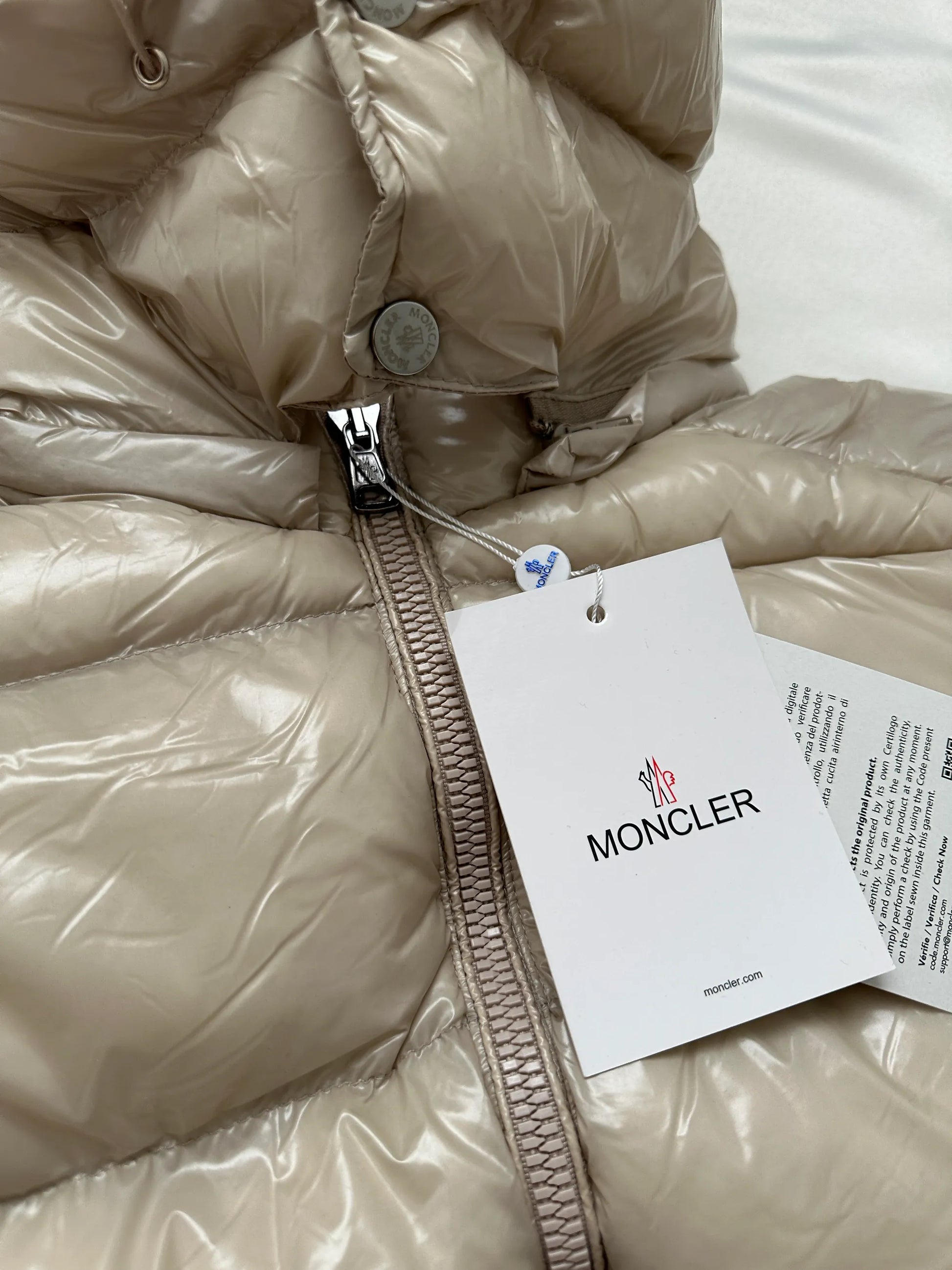 Elevate your winter wardrobe with the MONCLER MAYA HOODED SHINY COAT in a luxurious cream color. This sleek and stylish puffer coat is crafted with Moncler's signature attention to both fashion and function, making it a standout piece for cold-weather wear.
